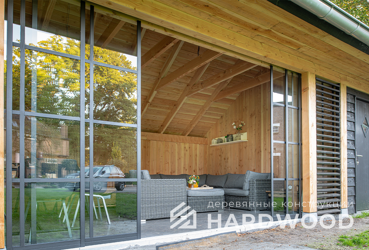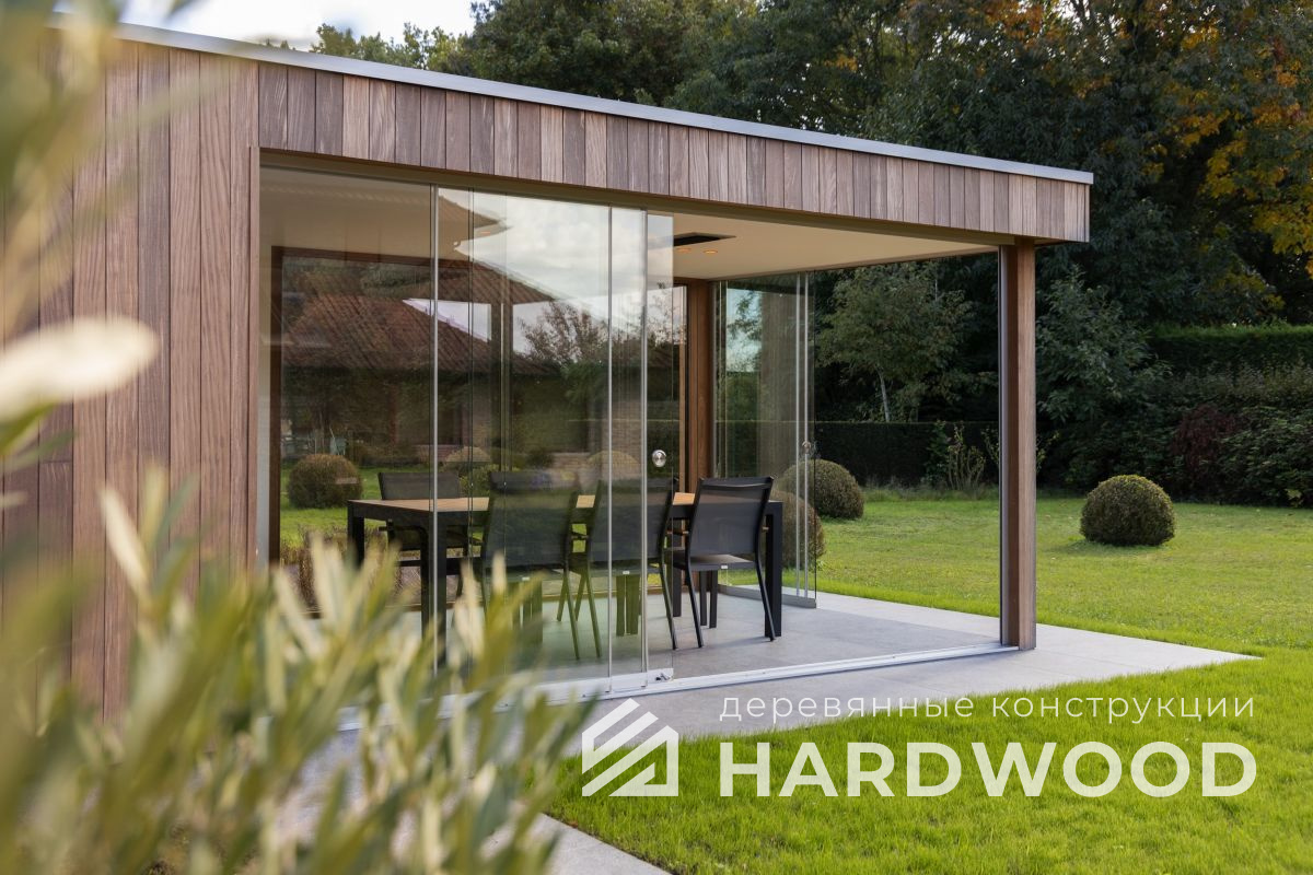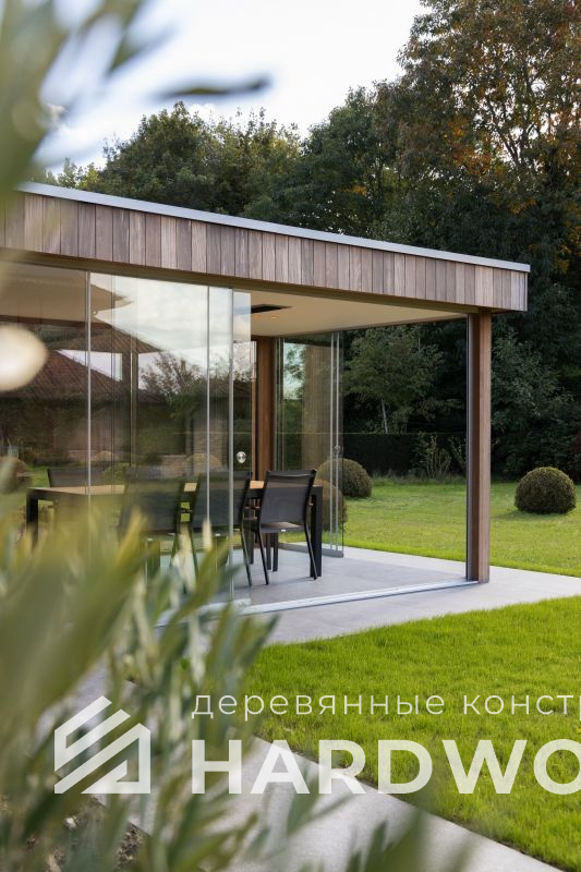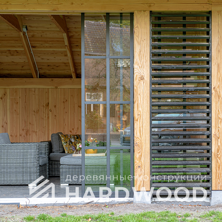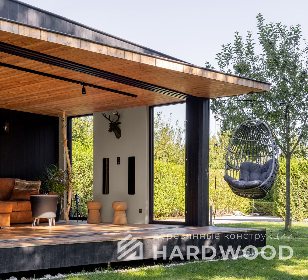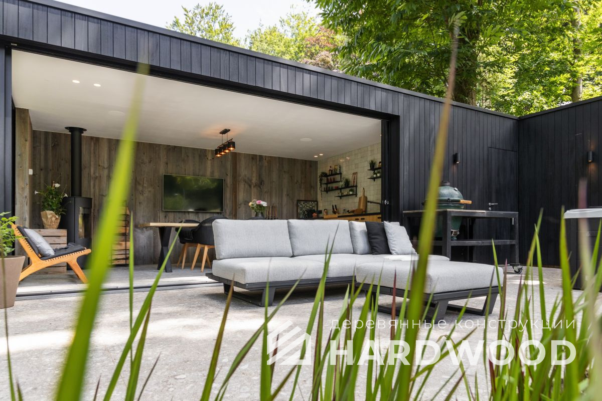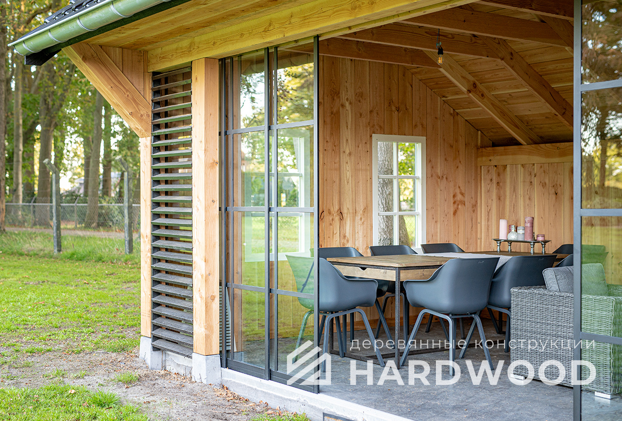 Лофт вырос из индустриальной эстетики: прямые линии, понятный каркас, фактура материалов на первом плане. В беседке это выражается в открытых балках, строгой геометрии, крупном остеклении и функциональности каждой детали. Никакой визуальной «тяжести» — только то, что работает на комфорт и стиль.
