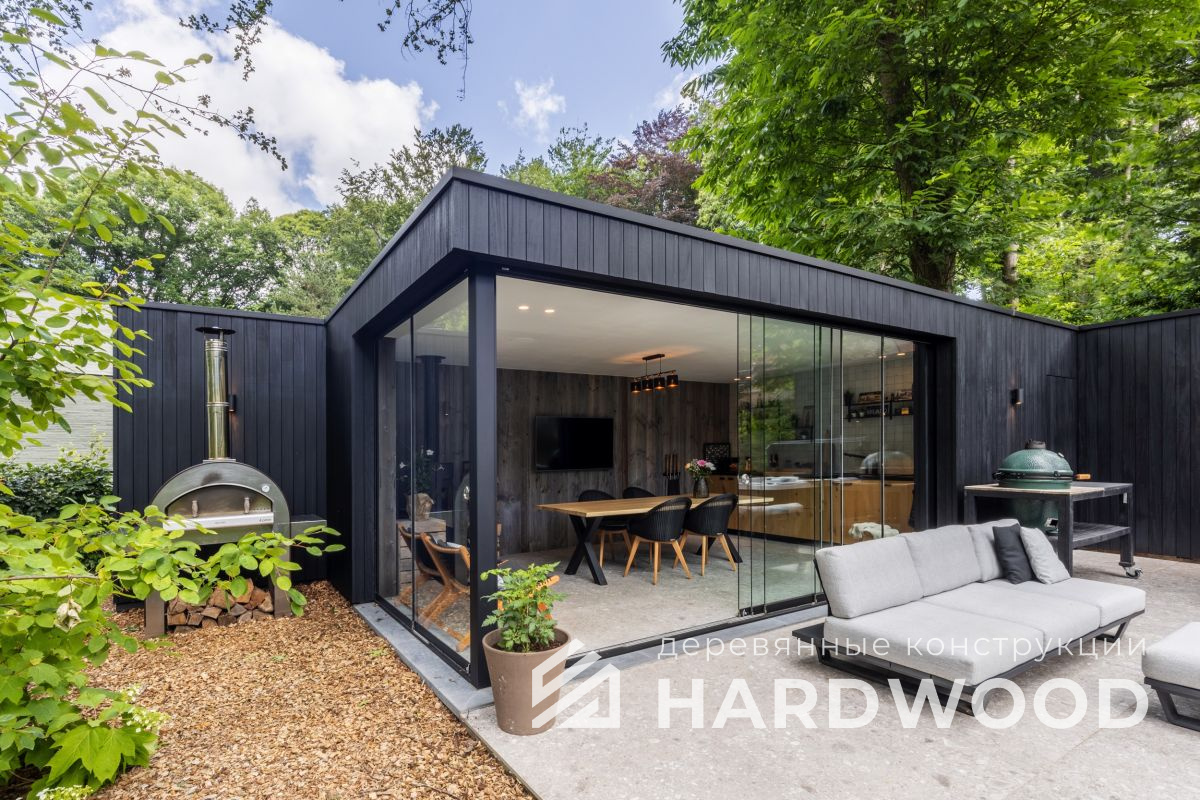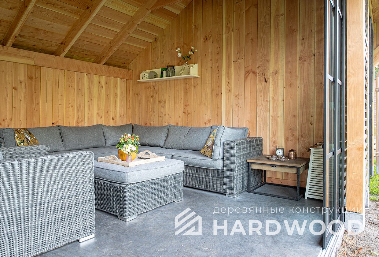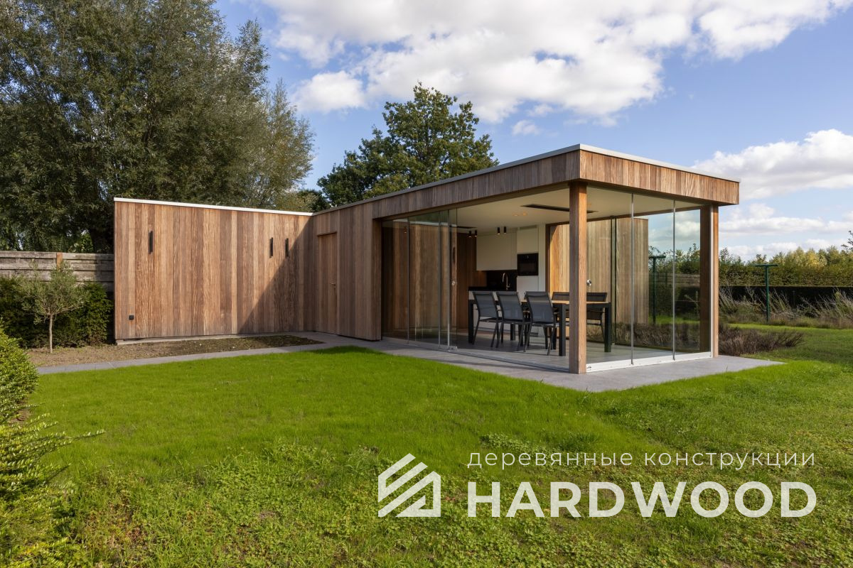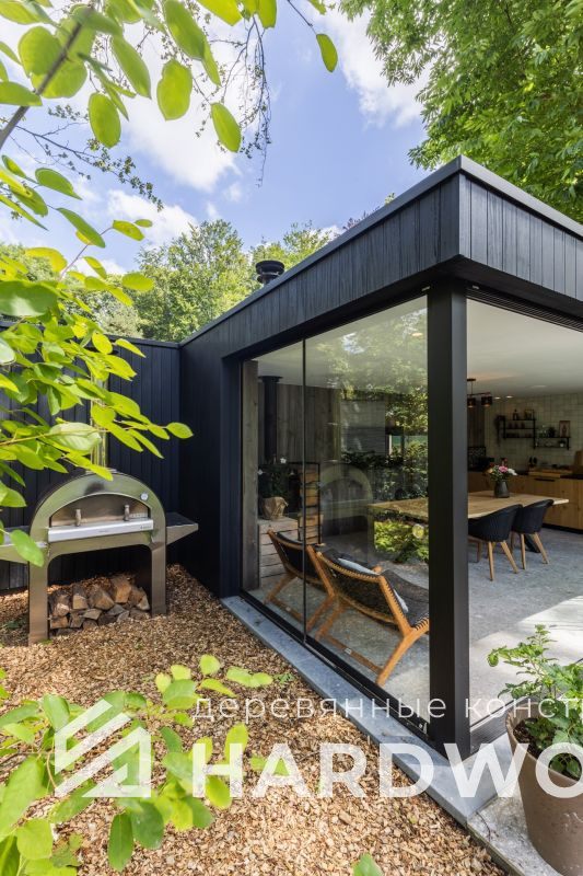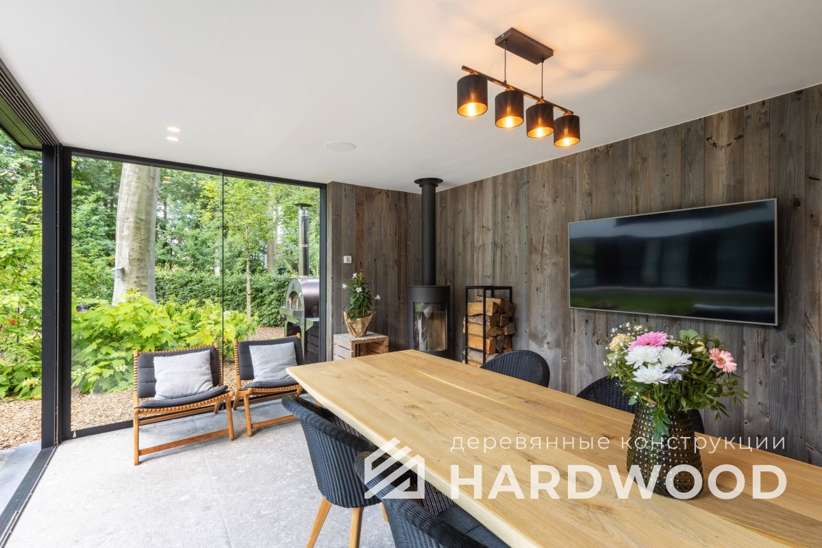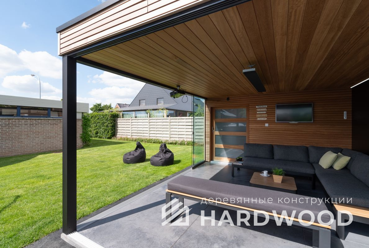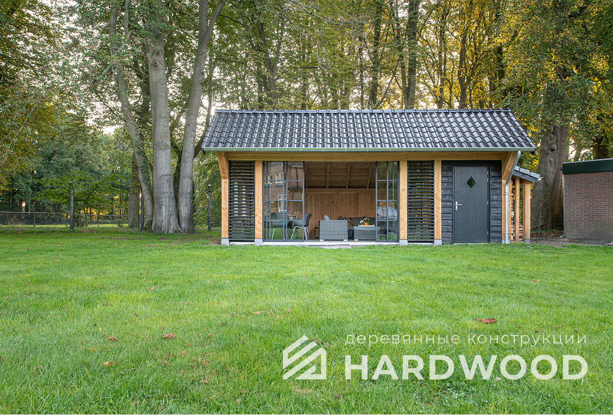 Лофт вырос из индустриальной эстетики: прямые линии, понятный каркас, фактура материалов на первом плане. В беседке это выражается в открытых балках, строгой геометрии, крупном остеклении и функциональности каждой детали. Никакой визуальной «тяжести» — только то, что работает на комфорт и стиль.