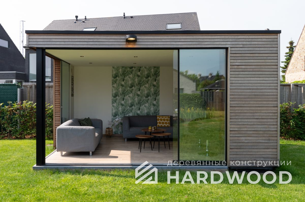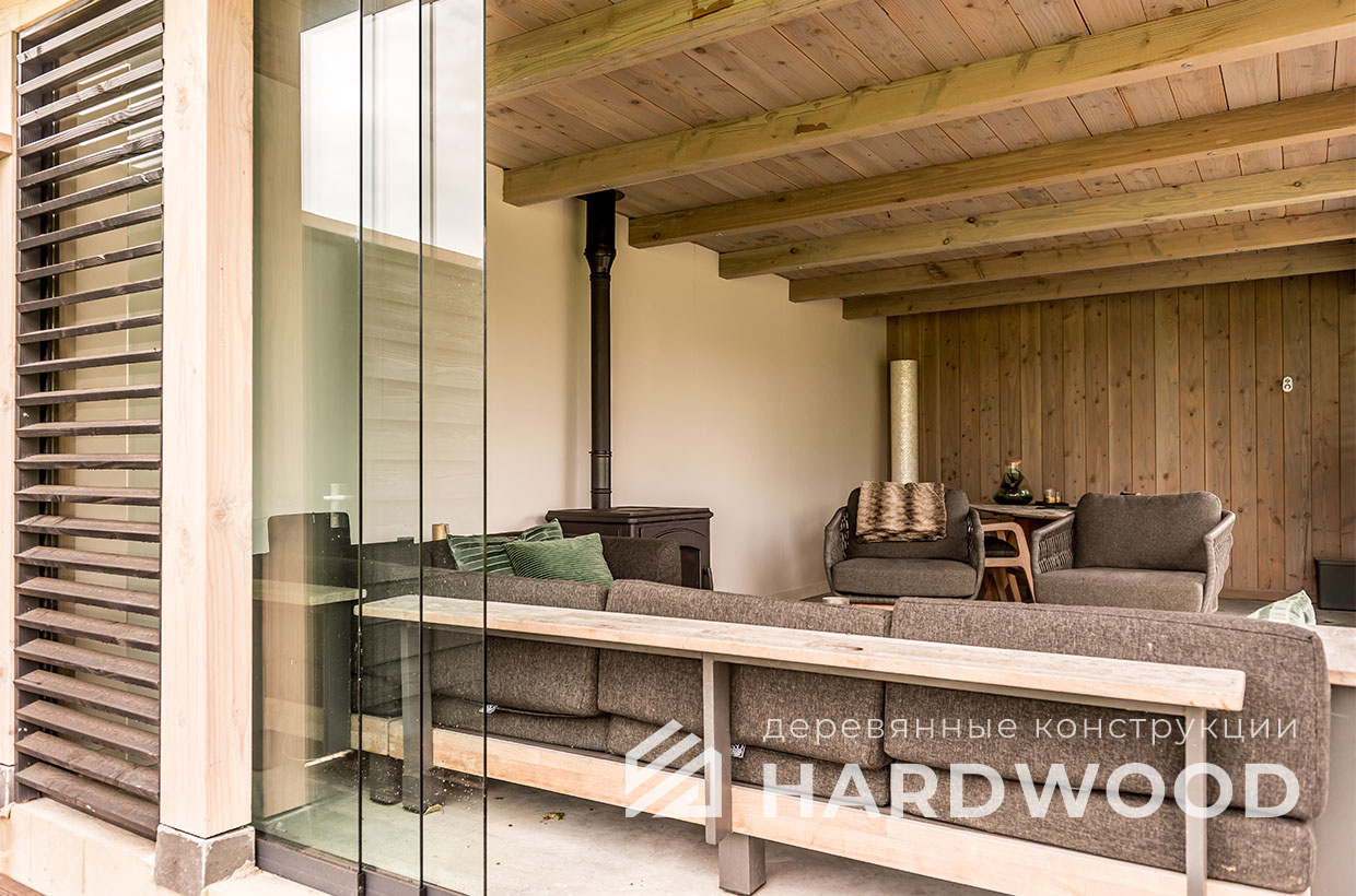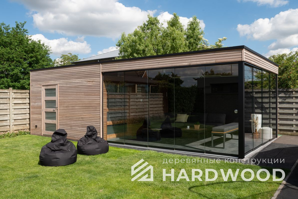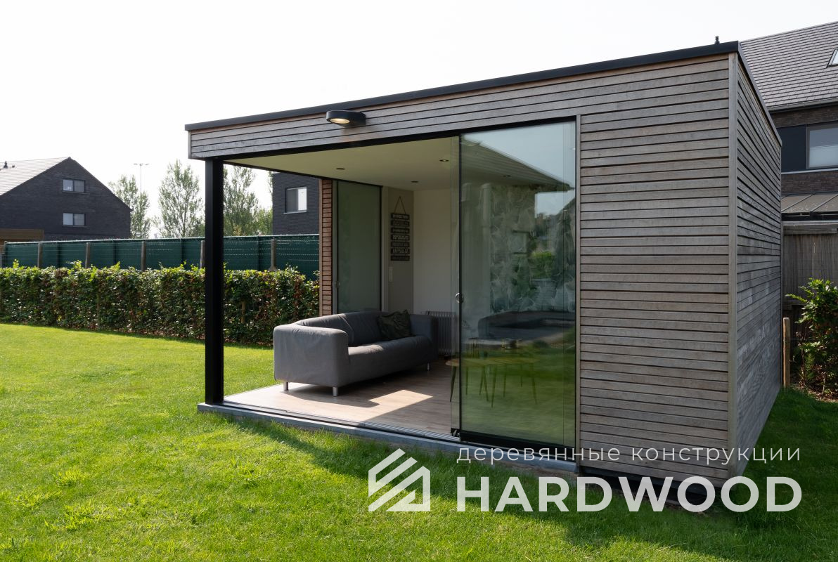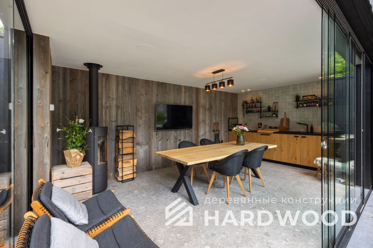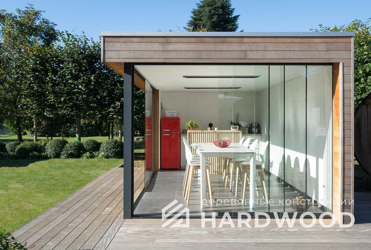 Лофт вырос из индустриальной эстетики: прямые линии, понятный каркас, фактура материалов на первом плане. В беседке это выражается в открытых балках, строгой геометрии, крупном остеклении и функциональности каждой детали. Никакой визуальной «тяжести» — только то, что работает на комфорт и стиль.