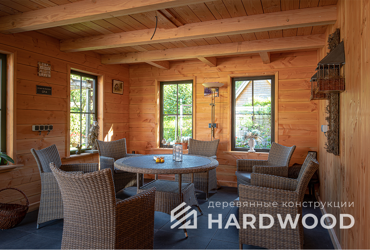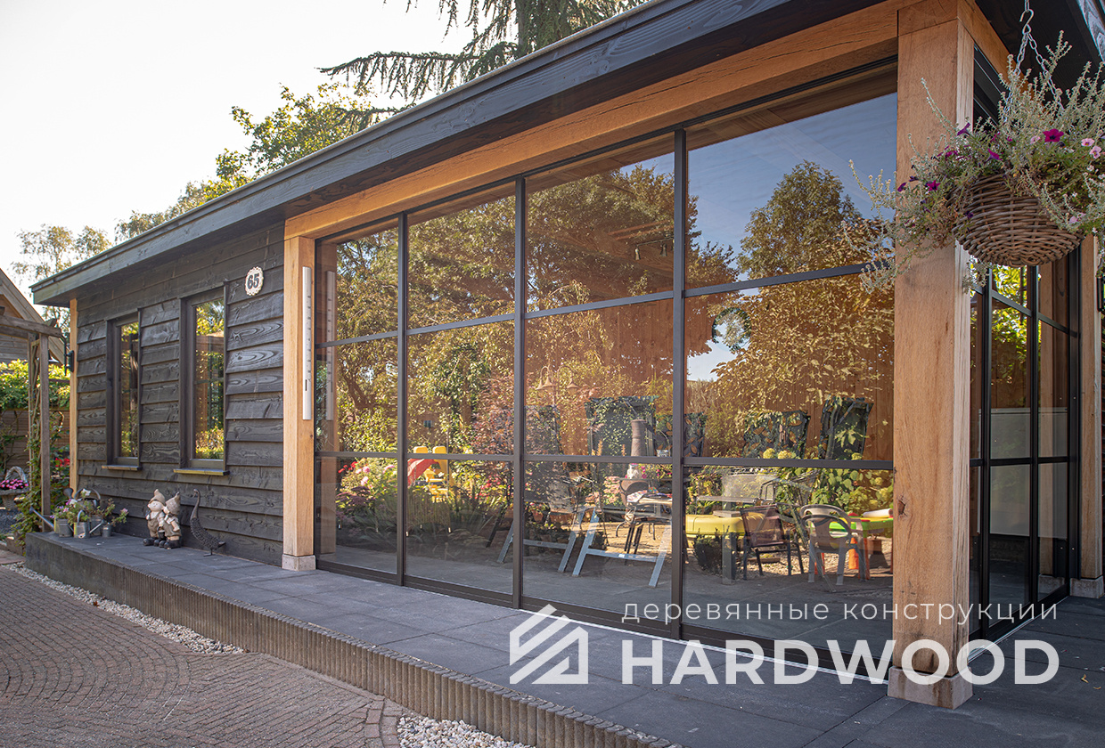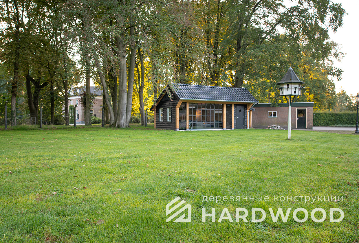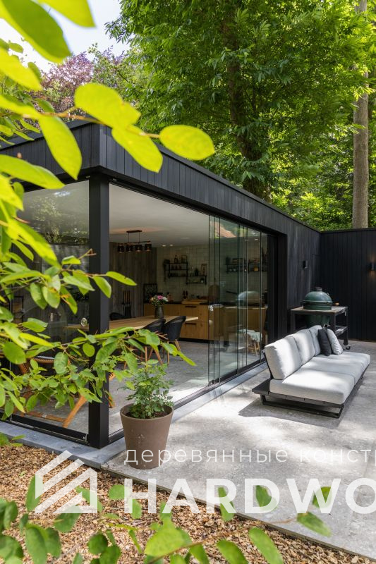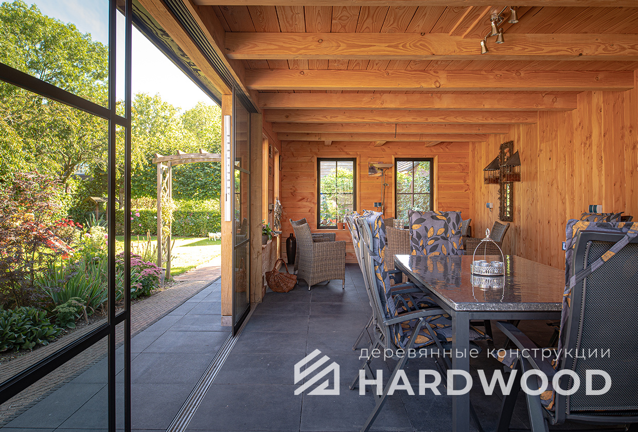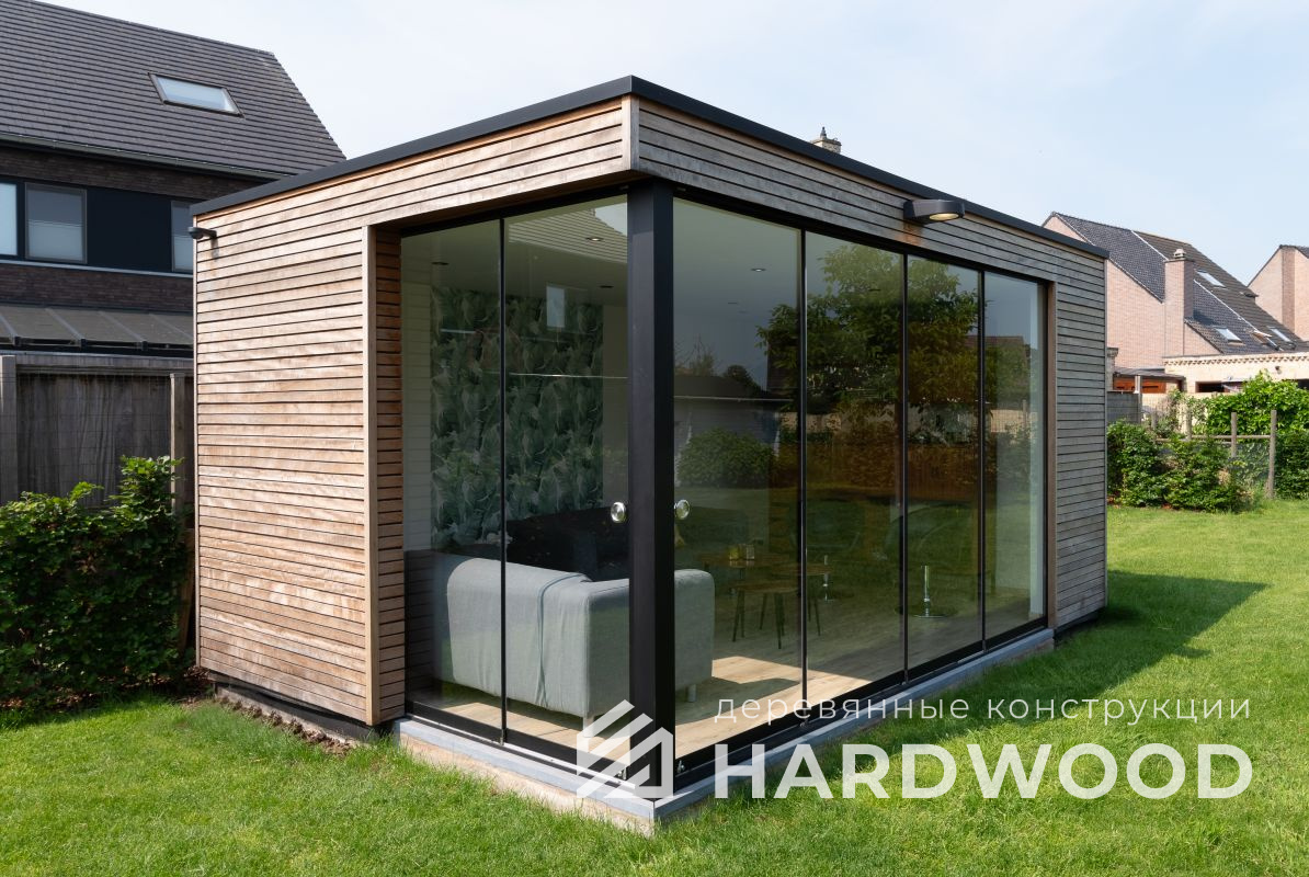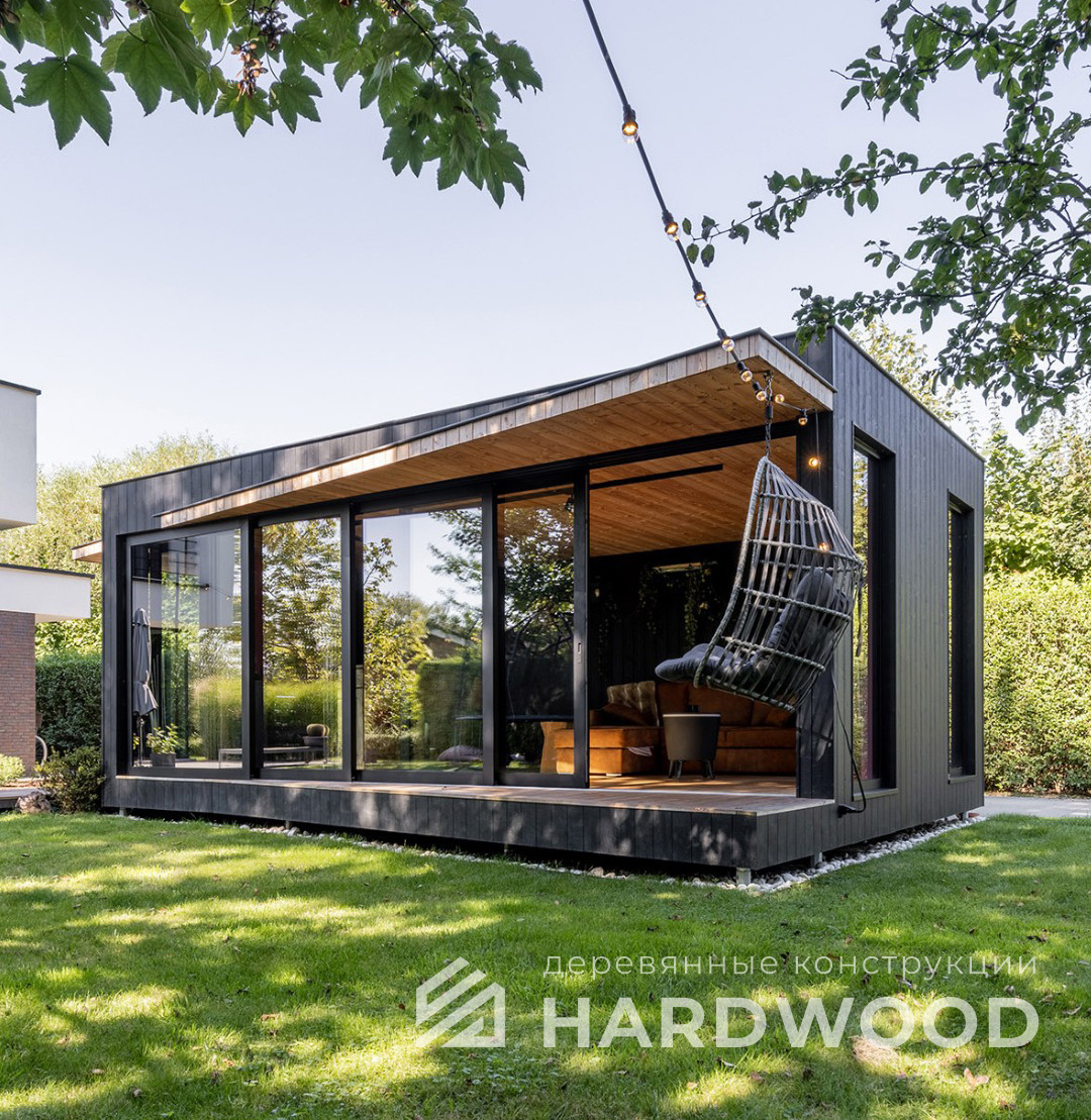 Лофт вырос из индустриальной эстетики: прямые линии, понятный каркас, фактура материалов на первом плане. В беседке это выражается в открытых балках, строгой геометрии, крупном остеклении и функциональности каждой детали. Никакой визуальной «тяжести» — только то, что работает на комфорт и стиль.