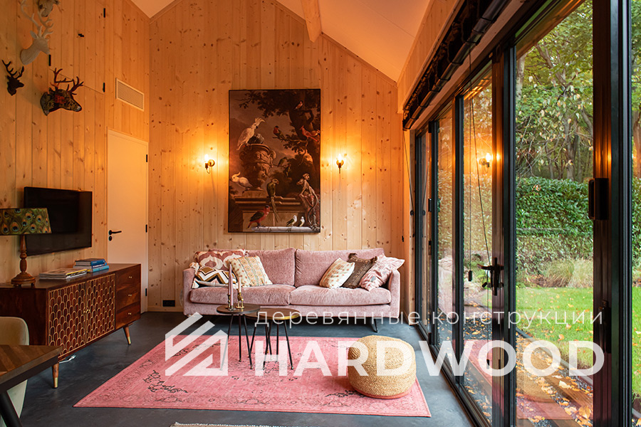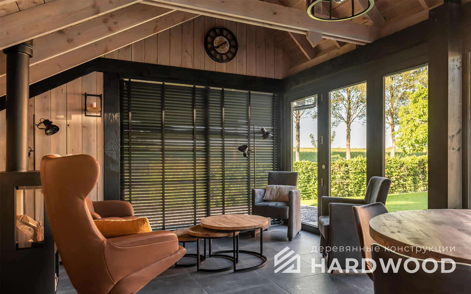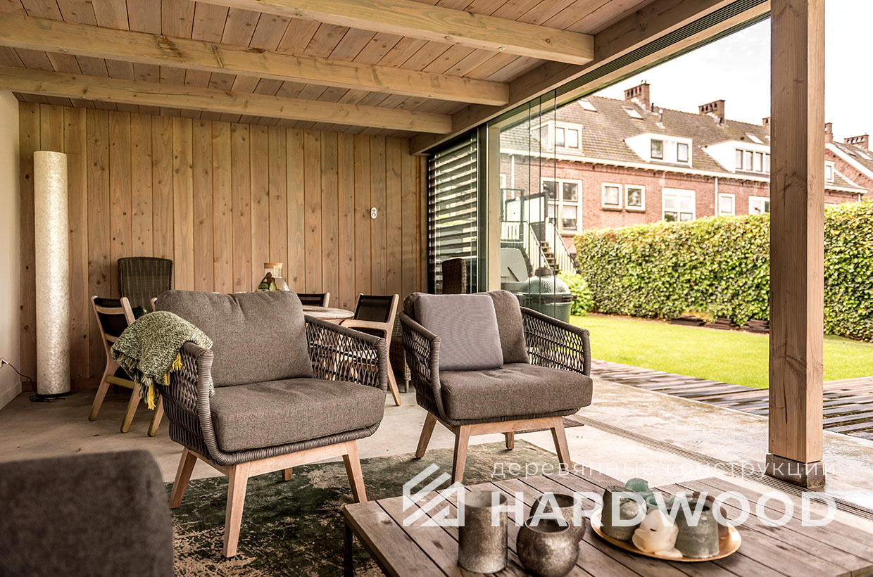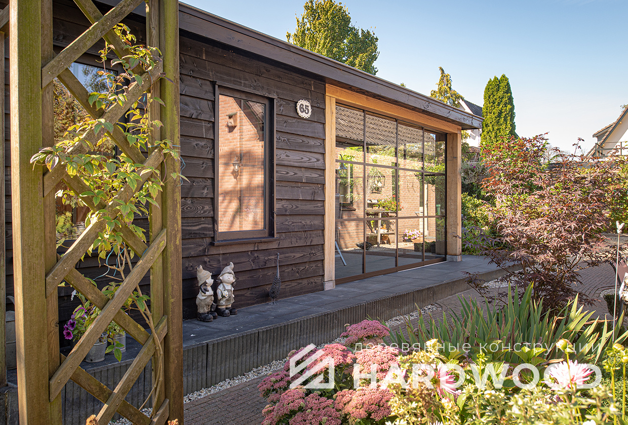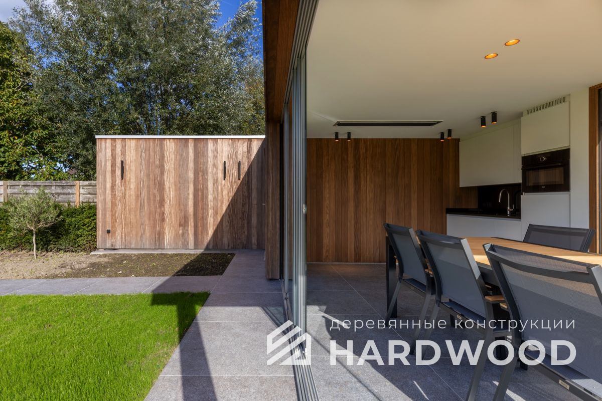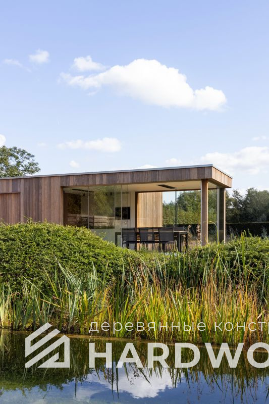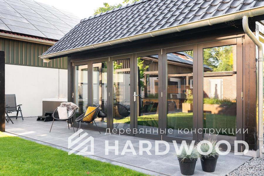 Лофт вырос из индустриальной эстетики: прямые линии, понятный каркас, фактура материалов на первом плане. В беседке это выражается в открытых балках, строгой геометрии, крупном остеклении и функциональности каждой детали. Никакой визуальной «тяжести» — только то, что работает на комфорт и стиль.