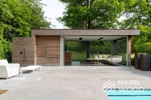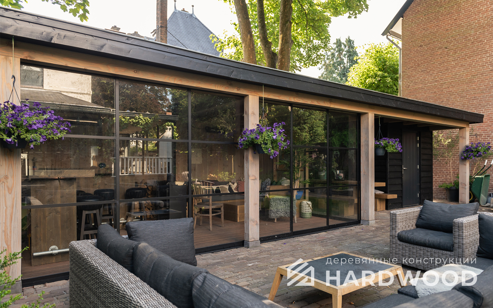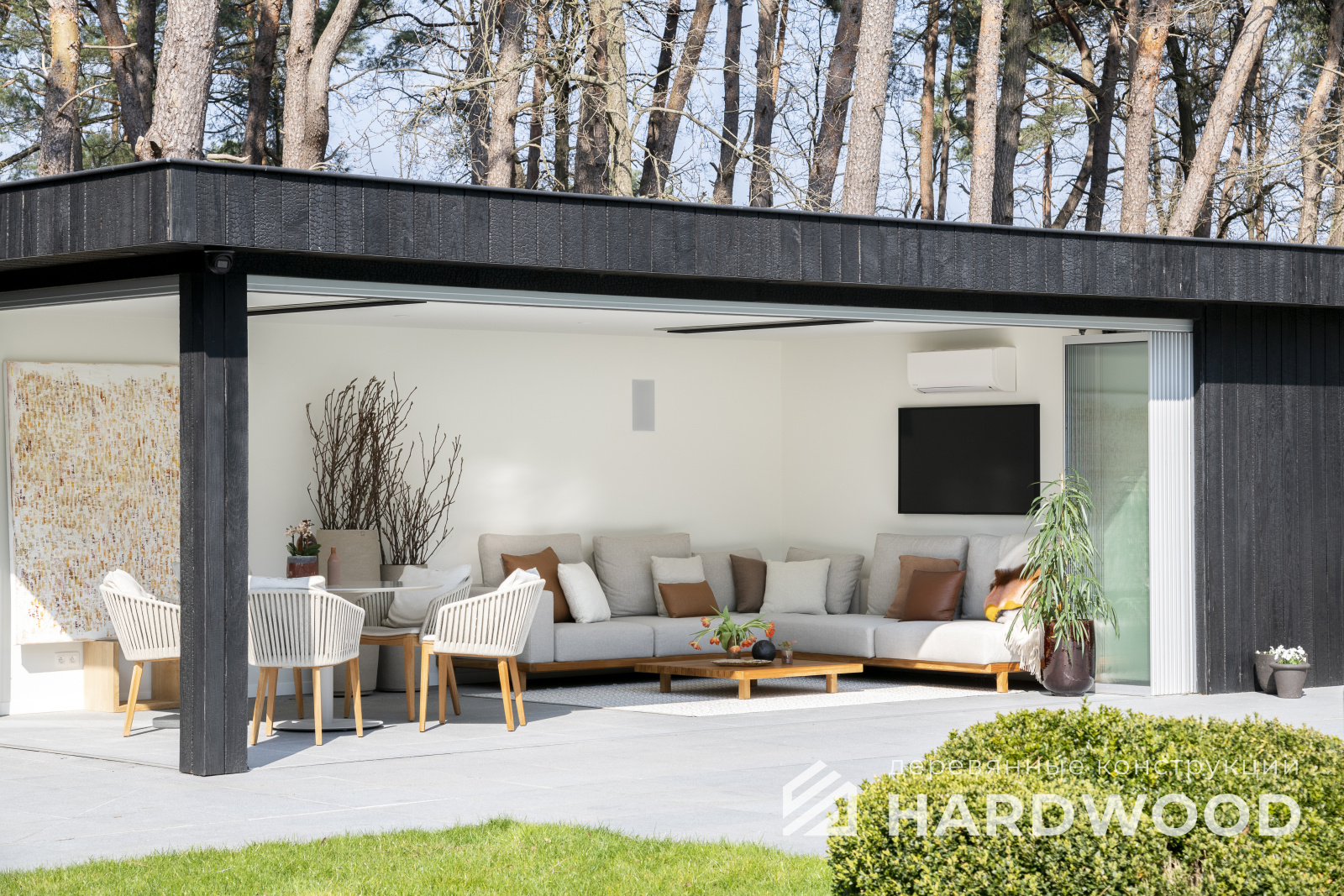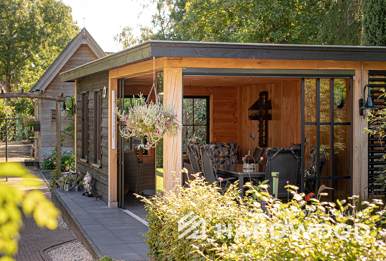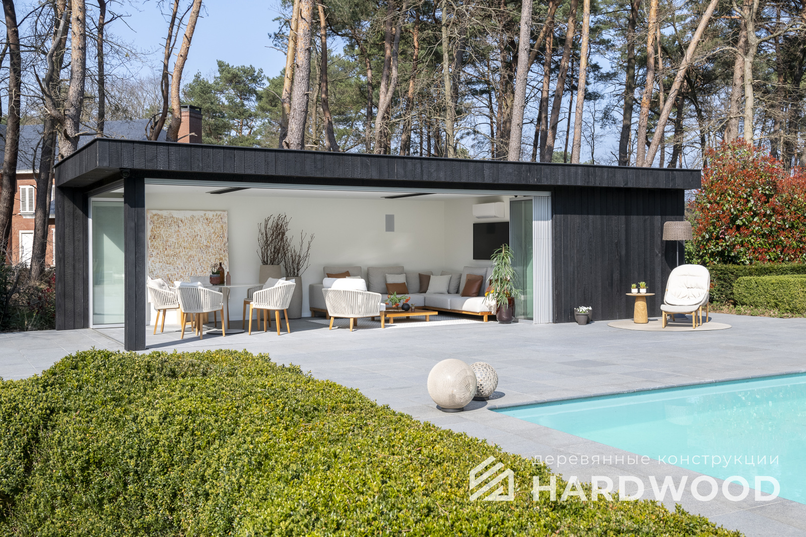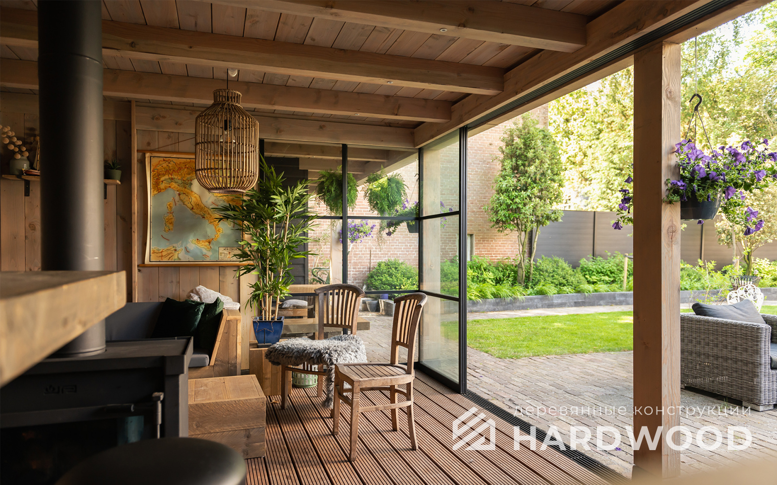 Лофт вырос из индустриальной эстетики: прямые линии, понятный каркас, фактура материалов на первом плане. В беседке это выражается в открытых балках, строгой геометрии, крупном остеклении и функциональности каждой детали. Никакой визуальной «тяжести» — только то, что работает на комфорт и стиль.