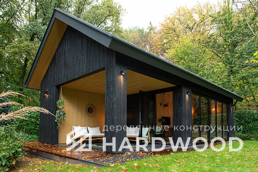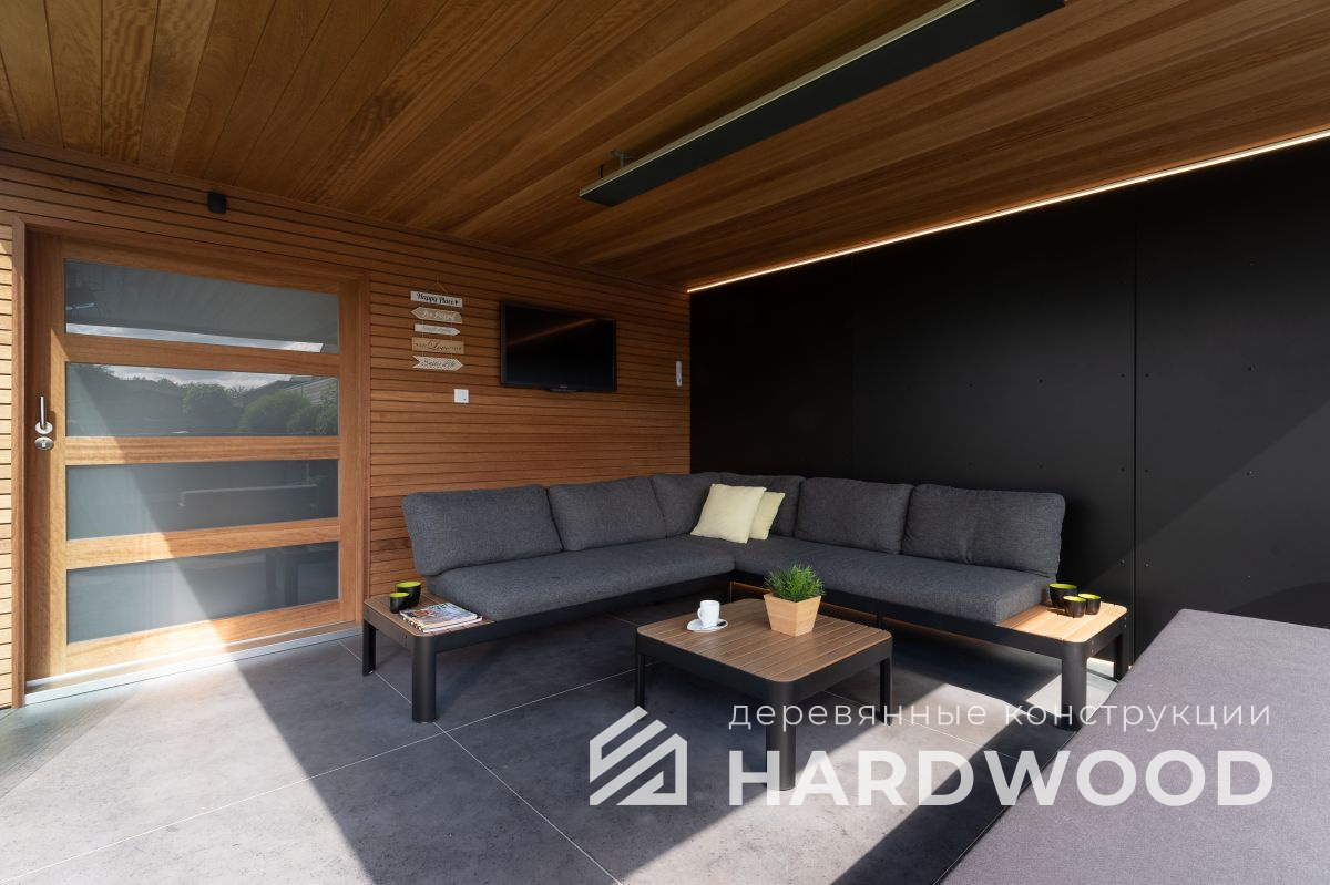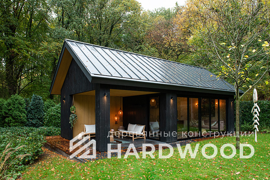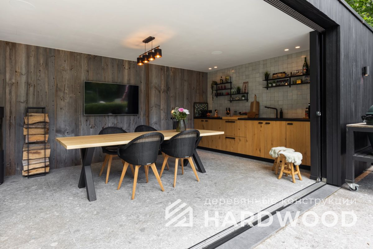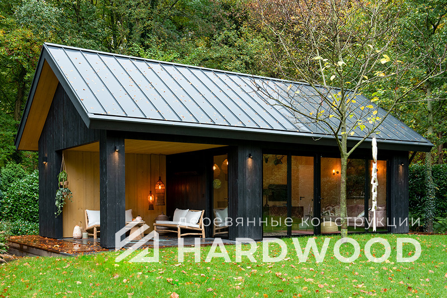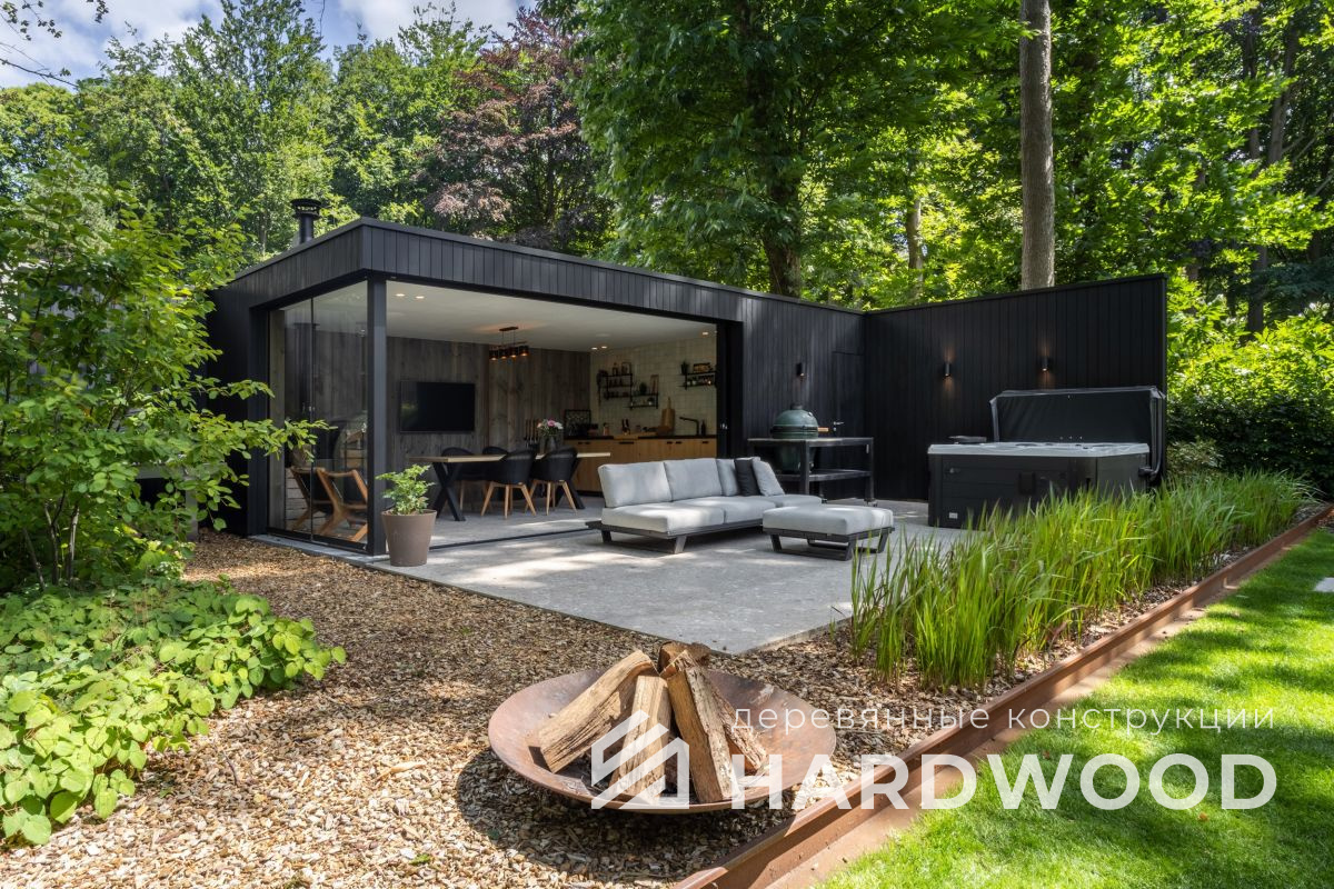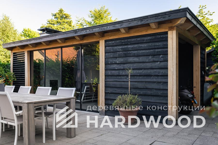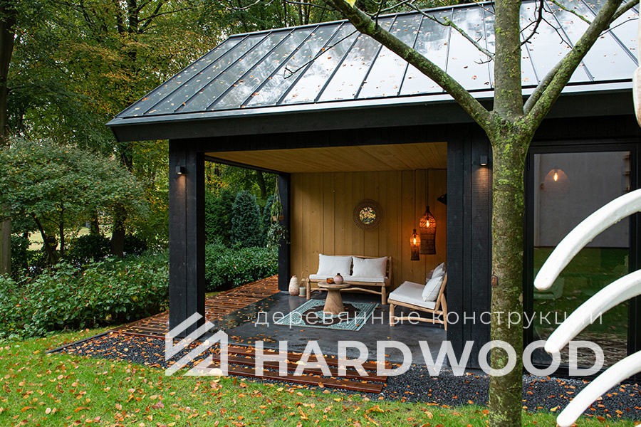 Определитесь с конструкцией и материалами. Для силуэта лофт характерны односкатные или плоские кровли, контраст дерева и металла, минималистичная обрешётка. Если важен всесезонный комфорт — подумайте о частичном остеклении, ветрозащите и подсветке; для летнего формата достаточно открытого павильона с навесом.
