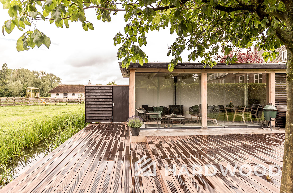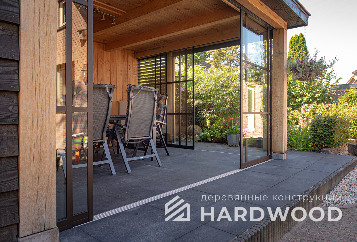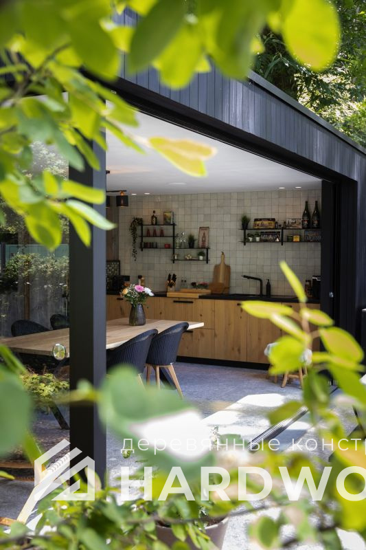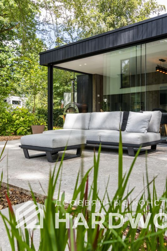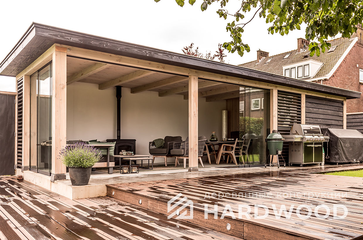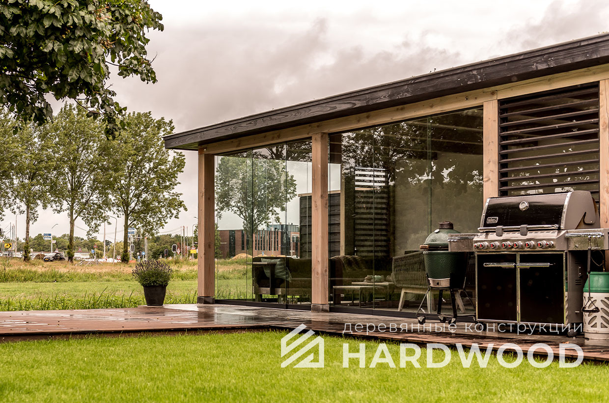 Такой подход особенно выигрышен на участке: конструкция не перегружает пространство, хорошо проветривается, быстро прогревается солнечным светом и гармонирует как с современным домом, так и с природным окружением. По сути, это ваша «микро-терраса-лофт» с возможностью интегрировать зону барбекю, хозблок и всё, что нужно для отдыха.
